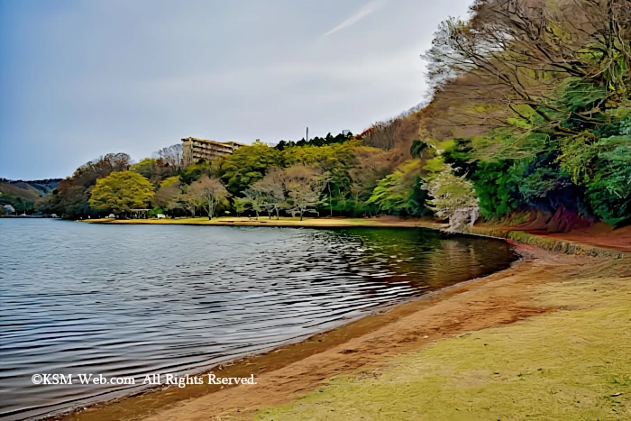 一碧湖は南東から北西に伸びたひょうた ん型をしており、北西側を大池(おおい け)、市道の橋を挟んで、南東側の比較 的は西側に十二連島という小島群を持つ 沼池はその名のとおり沼地または湿地帯 となっており、葦などの植物が繁茂する
